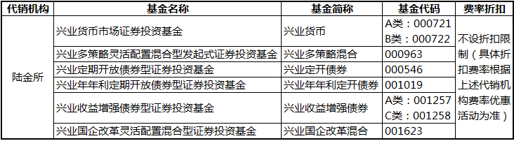 根据兴业基金管理有限公司(以下简称"本公司")与上海陆金所资产管理有限公司(以下简称“陆金所”)签署的基金销售代理协议,自2015年11月17日起,本公司新增上海陆金所资产管理有限公司为本公司旗下兴业货币市场证券投资基金(基金简称:兴业货币,基金代码:A类000721,B类000722)、兴业多策略灵活配置混合型发起式证券投资基金(基金简称:兴业多策略混合,基金代码:000963)、兴业定期开放债券型证券投资基金(基金简称:兴业定开债券,基金代码:000546)、兴业年年利定期开放债券型证券投资基金(基金简称:兴业年年利定开债券,基金代码:001019)、兴业收益增强债券型证券投资基金(基金简称:兴业收益增强债券,基金代码:A类001257,C类001258)、兴业国企改革灵活配置混合型证券投资基金(基金简称:兴业国企改革混合,基金代码:001623)的代销机构。